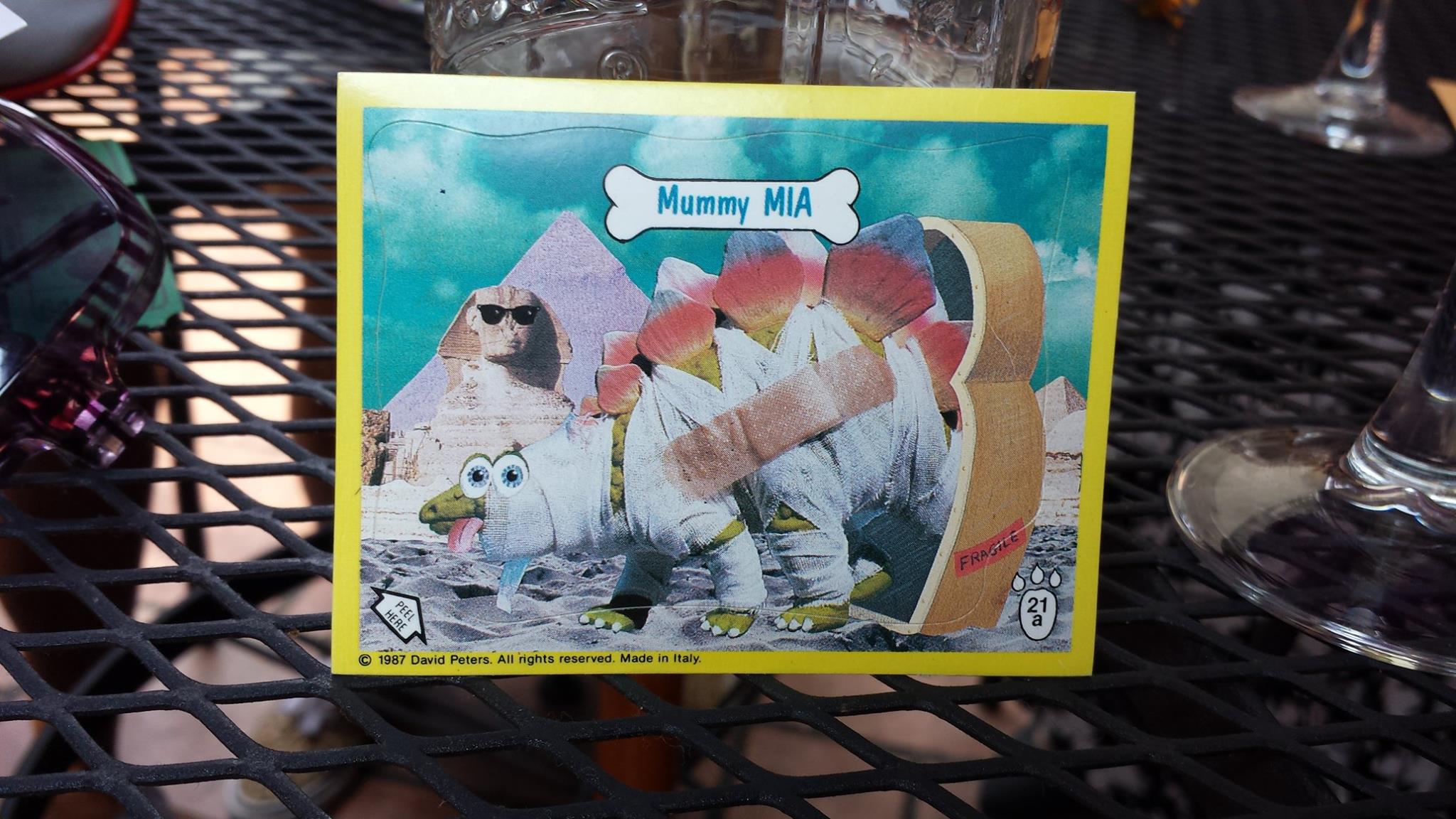 Oh! Amanda brought some really cool sticker cards called “Wacko-saurs” (want to know more? Check out this link) of which she gave us first pick from her stack since we sat at her table. I chose, appropriately enough, Mummy Mia: